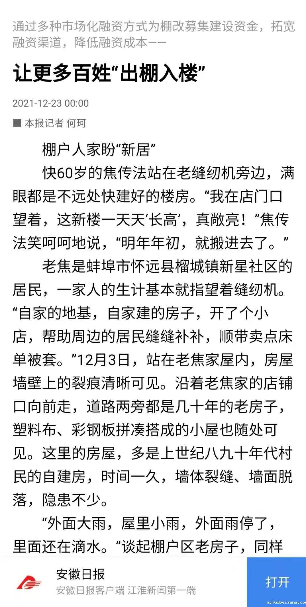 “2017年,在省棚改理事会的支持下,我们发行了阜阳滨河花园项目收益债,该收益债也是安徽省首单发行成功的‘棚改项目收益债’,为低成本拓宽棚改项目融资渠道做了新的有益探索。”省建设投资有限责任公司副总经理冯从敢介绍说。2018年初,我省提出用2年至3年时间基本完成城市集中连片棚户区改造任务。以此为契机,省雷竞技网站有效率和怀远县协调对接,将怀远县作为我省市场化棚改模式在县级试水第一站。