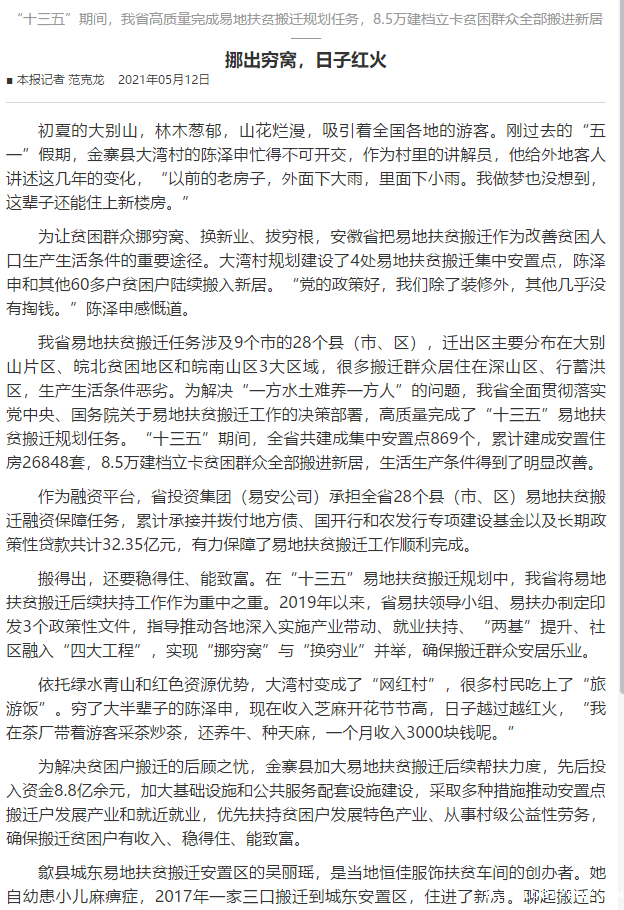 为让贫困群众挪穷窝、换新业、拔穷根,安徽省把易地扶贫搬迁作为改善贫困人口生产生活条件的重要途径。大湾村规划建设了4处易地扶贫搬迁集中安置点,陈泽申和其他60多户贫困户陆续搬入新居。 “党的政策好,我们除了装修外,其他几乎没有掏钱。”陈泽申感慨道。