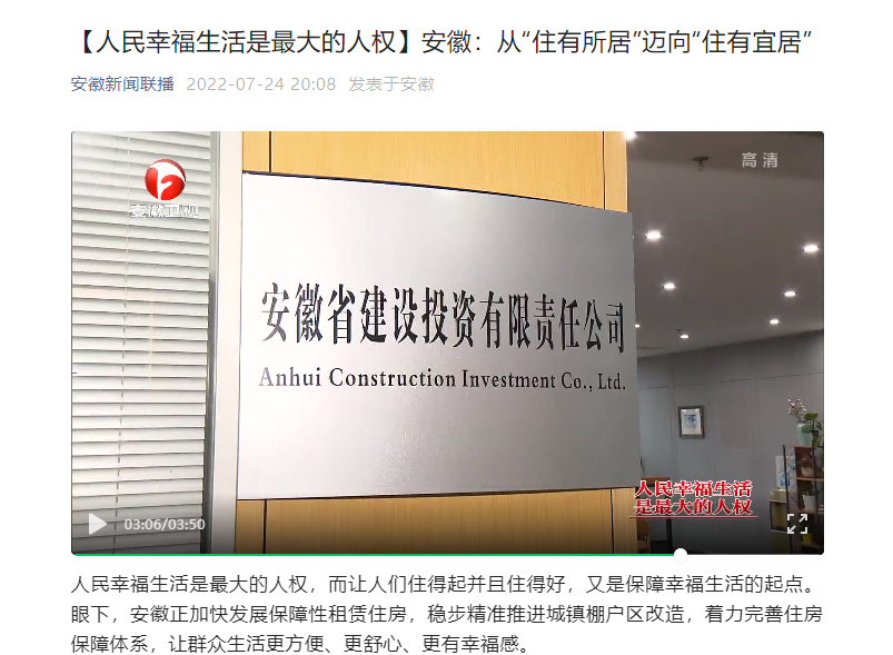 7月24日,《安徽新闻联播》播报《【人民幸福生活是最大的人权】安徽:从“住有所居”迈向“住有宜居”》,介绍安徽加快发展保障性租赁住房,稳步精准推进城镇棚户区改造,着力完善住房保障体系,让群众生活更方便、更舒心、更有幸福感。节目中,安徽省雷竞技网站有效率作为创新棚改融资方式的突出企业,精彩亮相。