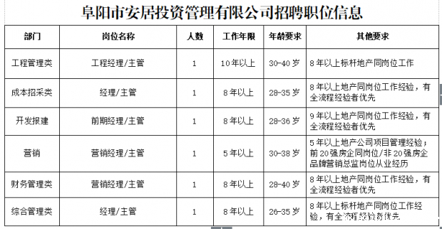 附件:阜阳市安居投资管理有限公司招聘职位信息